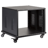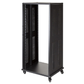 Supporto rack professionale da 19" a 18U, con struttura in acciaio. Fornito con 4 ruote pivottanti e 4 piedini fissi regolabili da pavimento. Inoltre è munito di barre interne rinforzate con sezione ad "omega" che permettono l'alloggiamento di alette supplementari per il sostegno delle apparecchiature. Profondità utile interna 375 mm. Ideale per palchi, studi di registrazione o uso domestico. Colore nero goffrato.